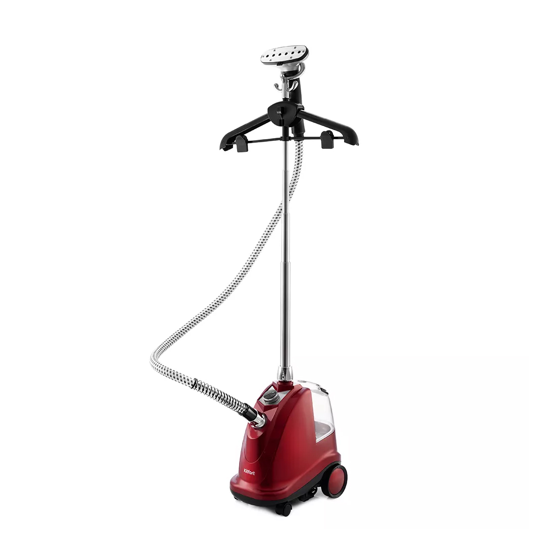 Вешалка и телескопическая стойка складные, а корпус отпаривателя компактный. Такая конструкция позволяет удобно хранить его в комнате или в шкафу. Корпус прибора оснащён колесиками для удобного перемещения по квартире.
